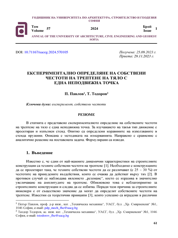 Експериментално определяне на собствени честоти на трептене на тяло с една неподвижна точка. Годишник на Университета по архитектура, строителство и геодезия - УАСГ. София: УАСГ, 57 (бр. 1.), с. 61 - 68.
